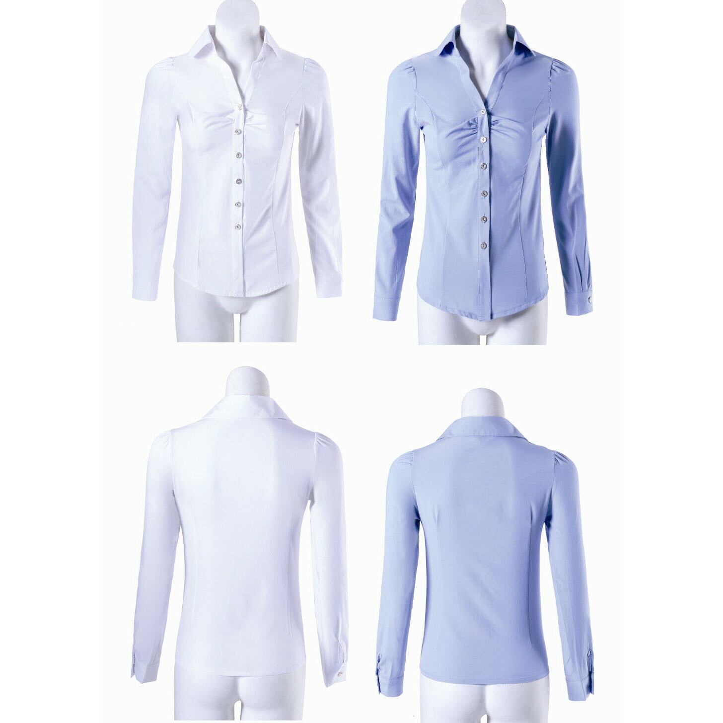 【送料無料】 シャツ・長袖・襟付き・Vネック・青シャツ・前開き・レディース・ワイシャツ・ホワイト・ブルー・長袖シャツ・S・M・L・XL・女性・ボタン・OL・大人・オフィス・ストレッチ・ホワイトシャツ・ホワイトブラウス・カッターシャツ・ブルーシャツ・ブラウス・ブルーブラウス・丸襟・白・白シャツ・通勤・青・インナー・スーツインナー